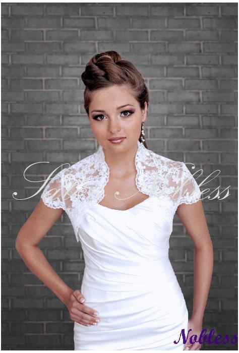 Krajkové bolerko s krátkým rukávkem je luxusním doplňkem Vašich svatebních šatů. Kvalitní krajka je jemně dozdobena perličkami. Bolerko je velmi elegantní.