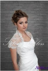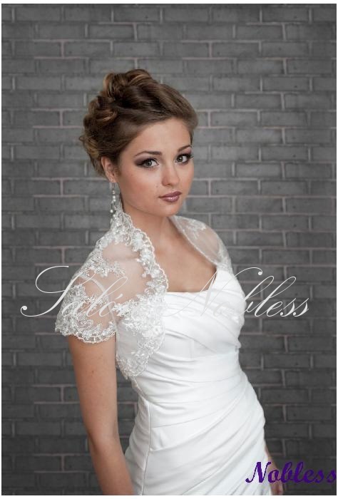Luxusní bolerko z krásné krajky protkané jemně stříbrnou nitkou. Úžasně doplní nejen svatební šaty, ale také závoj, který lze objednat se stejnou krajkou v délce do pasu nebo ke kotníkům. Jedná se opravdu o krajku( žádná vyšívaná organza).