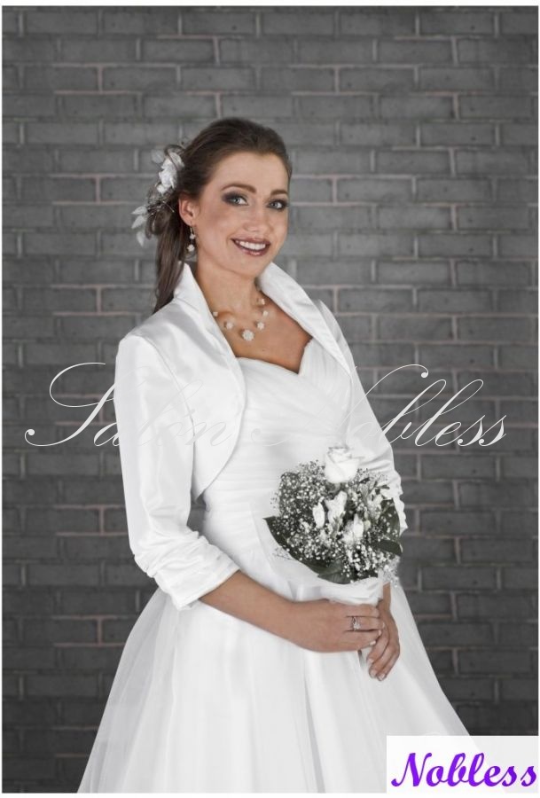 Krásné bílé taftové bolerko s tříčtvrtečním rukávem, velmi elegantní. Velikost M skladem, ostatní velikosti na objednání.