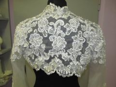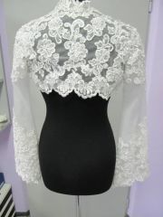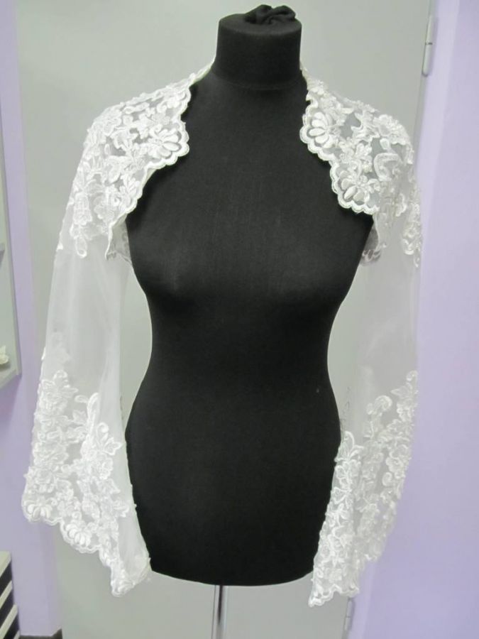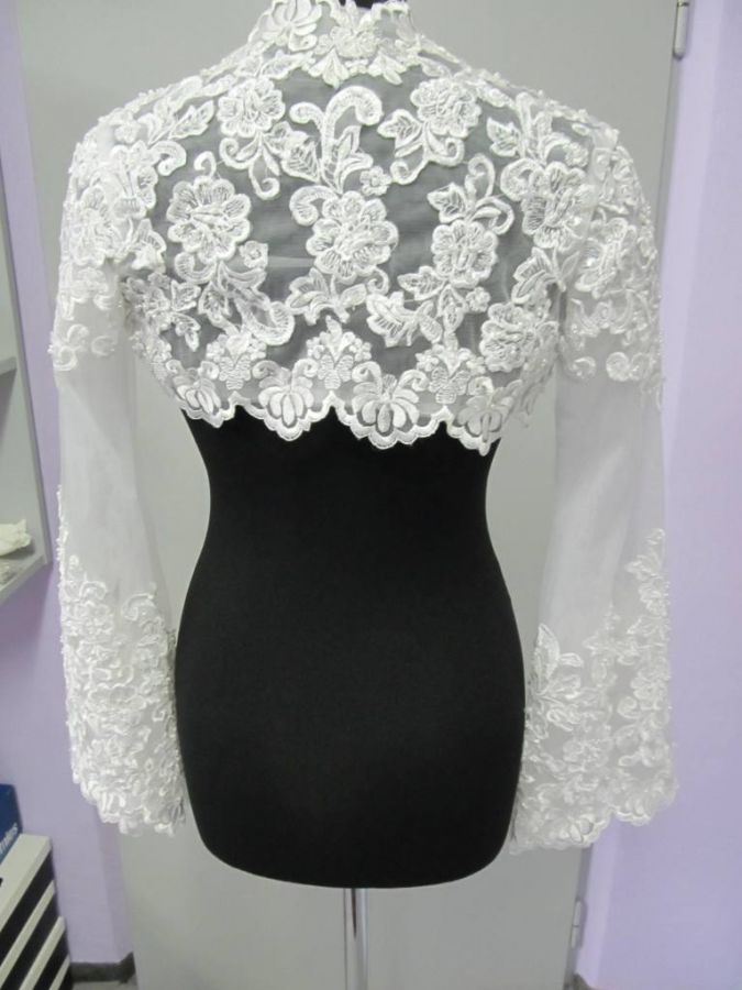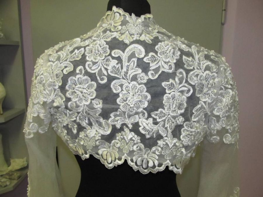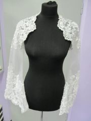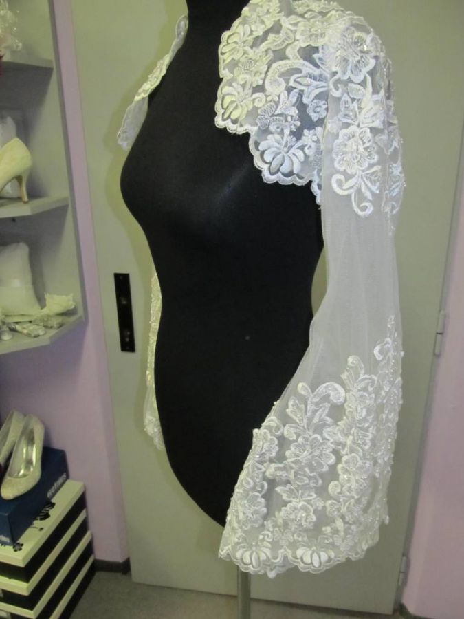 Luxusní bílé krajkové bolerko s rozšířenými princes rukávy, zdobené perličkami a flitry, stav - nové, vel.: 34/36.