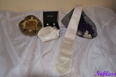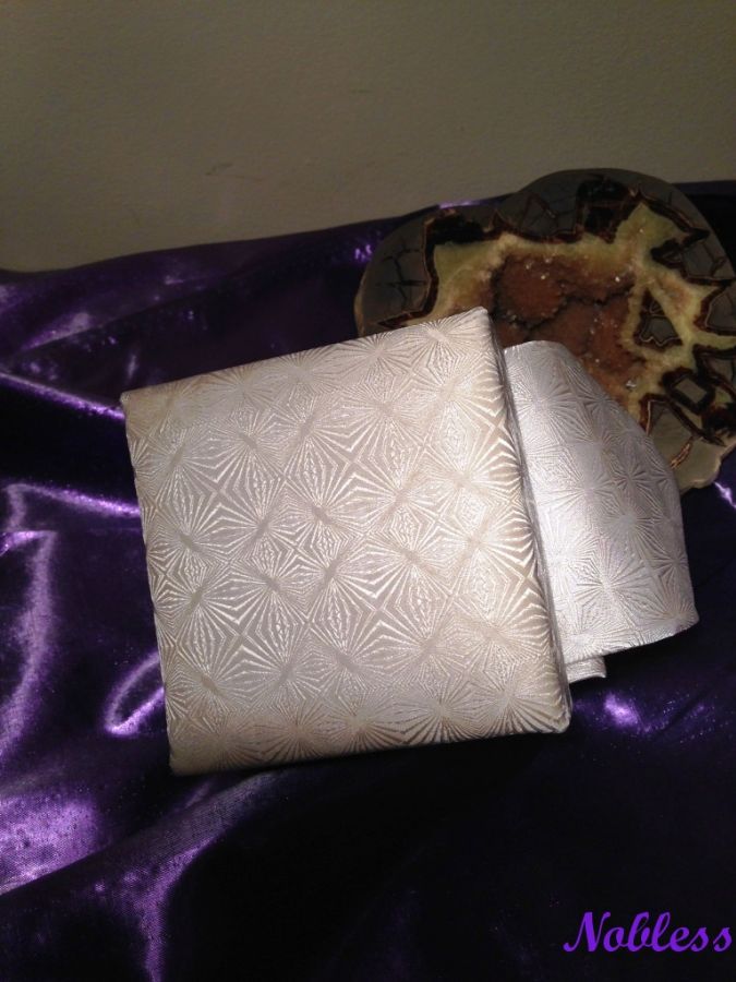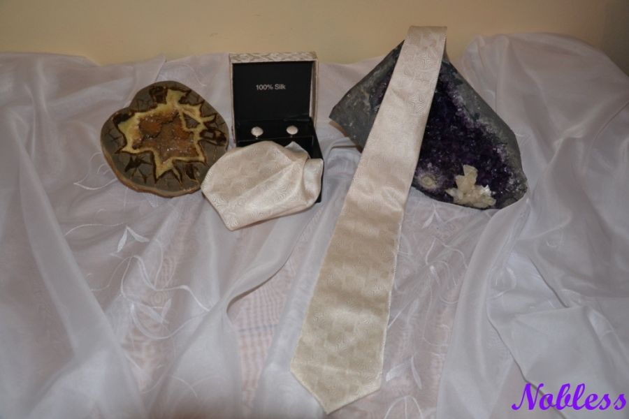 Luxusní svatební kravatový set z hedvábné tkaniny s kapesníčkem a manžetovými knoflíčky.