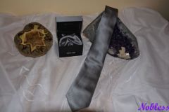 Luxusní kravatový set z hedvábné tkaniny s kapesníčkem a manžetovými knoflíčky.