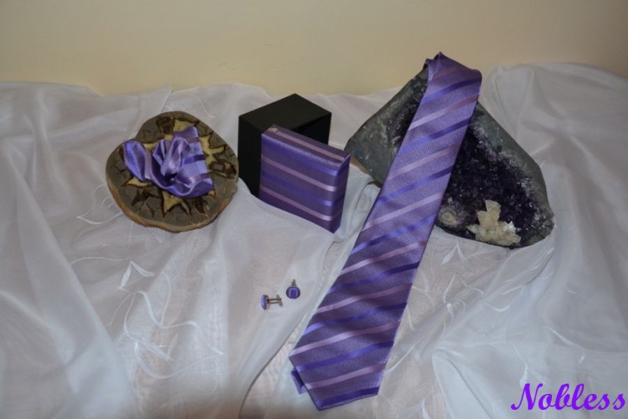 Luxusní kravatový set z hedvábné tkaniny s kapesníčkem a manžetovými knoflíčky.