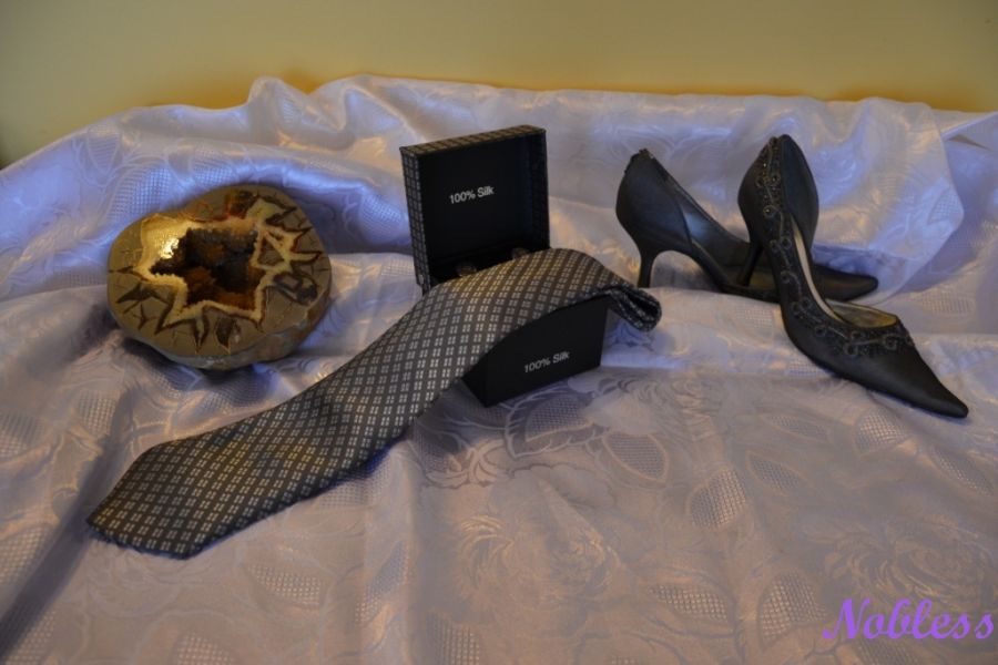 Luxusní kravatový set z hedvábné tkaniny s kapesníčkem a manžetovými knoflíčky.