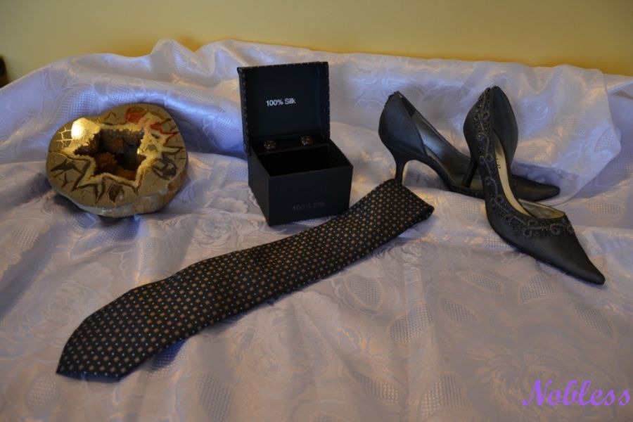 Luxusní kravatový set z hedvábné tkaniny s kapesníčkem a manžetovými knoflíčky.