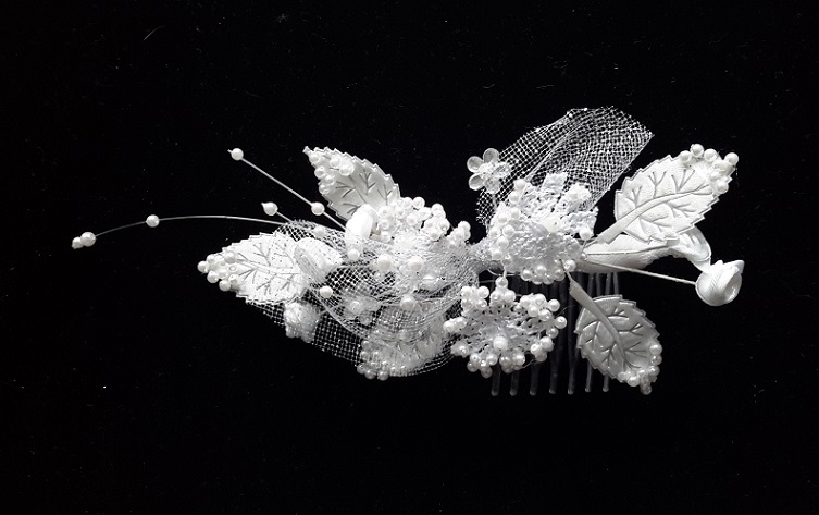Ozdoba na hřebínku zdobená krystaly a perličkami, vše bílé, lístečky z hedvábného saténu lehce tónované do šampaň.