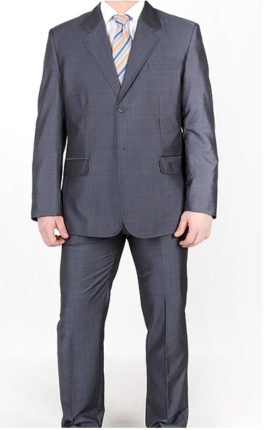Dvoudílný pánský oblek elegantního zúženého střihu v pololesklém namodralém odstínu. Sako se zapínáním na dva knoflíky, vzadu dva rozparky, čtyři manžetové knoflíčky.