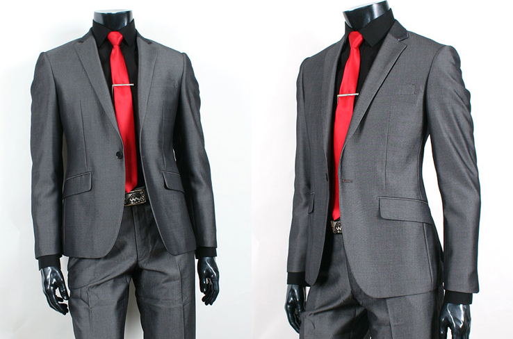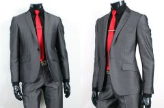 Šedý oblek s metalickým odleskem, mírně vypasovaný. Lze si k němu dokoupit vestu v hodnotě 700 Kč.
