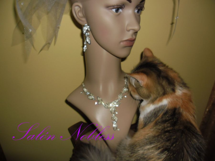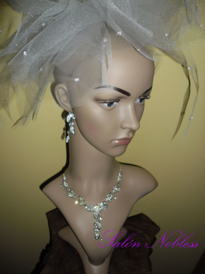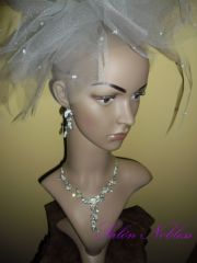 Souprava připomínající jemný filigrán s bílými kameny. Délka 36 cm + 12 cm prodlužovací řetízek. Naušnice cca 6 cm. Krásná a elegantní.
