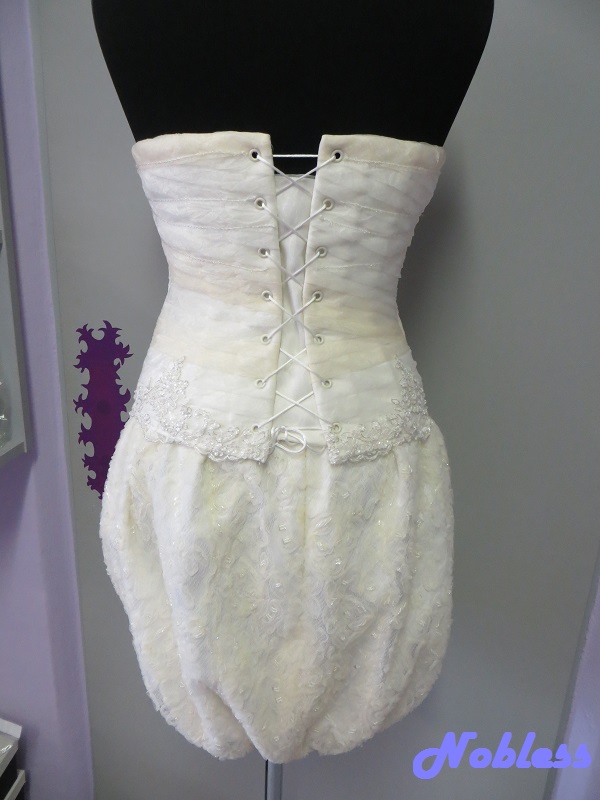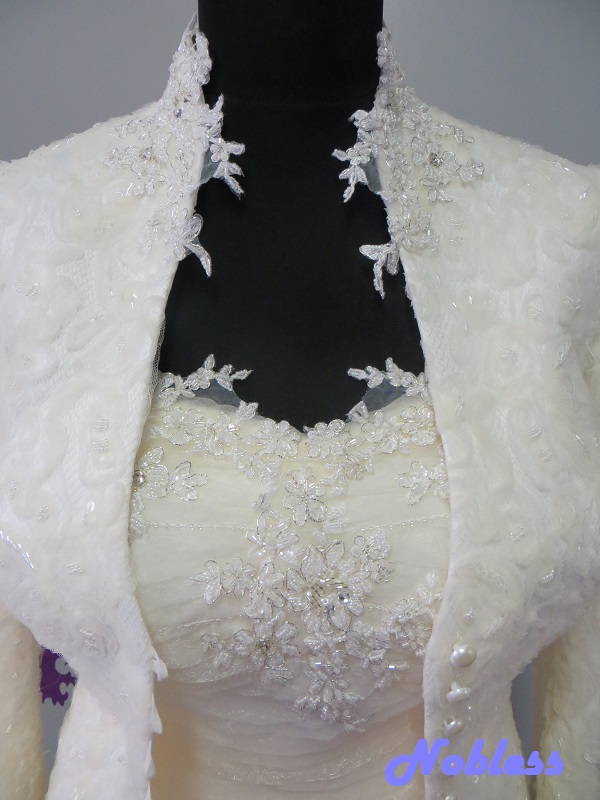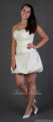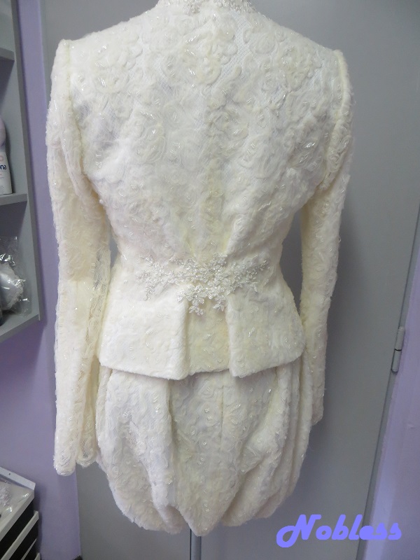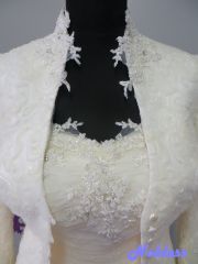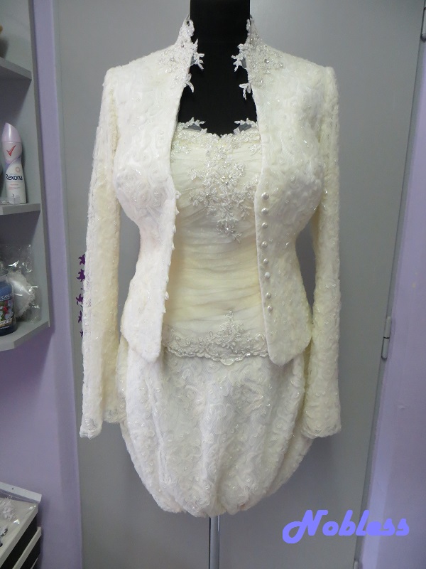 Trojdílný svatební komplet, který se skládá z balónové sukně, korzetu a sáčka s dlouhým rukávem. Materiál pajetková krajka na tylu zdobená korálky, svatební organtýn s krajkovou aplikací zdobený stříbrnou nitkou a korálky. Korzet má šněrování na tkanici. Všechny dílky jsou 2x podšívané umělým hedvábím a hedvábným saténem. vel. 36-38, stav - nové